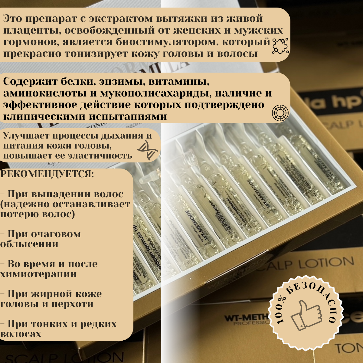WT Methode Placen Formula HP — профессиональный лосьон против выпадения волос с экстрактом вытяжки из живой плаценты, освобожденный от женских и мужских гормонов, созданный для тех, кто ценит здоровье и густоту своих волос. Формула разработана на основе активных компонентов, которые укрепляют волосы от корней до кончиков и заметно улучшают их внешний вид уже после первых процедур. Лосьон является биостимулятором, который прекрасно тонизирует кожу головы и волосы. Данный препарат, применяемый наружно, улучшает процессы дыхания и питания кожи головы, повышает ее эластичность.